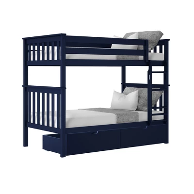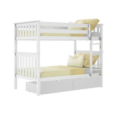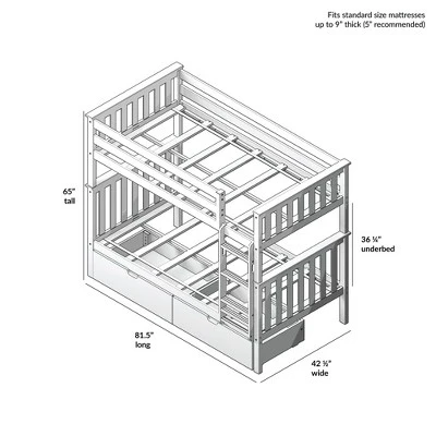 Plenty of room for sleep and play? Now that’s a win-win! The Max & Lily Twin Over Twin Bunk Bed with Under Bed Storage Drawers is the perfect combination of functional and fun that both kids and parents love. Top bunk features tall 14” guardrails, so the bed safely fits standard mattress sizes. Added under bed storage drawers make organizing a breeze. Angled ladder with rounded edges offers comfortable, easy climbing. Added bonus – ladder is both reversible and removable, so it is flexible to work with any space. Solid, knot-free New Zealand pine wood adds strength and stability. All Max & Lily products use a durable, low VOC finish. The slatted head and footboards and flush, color-matched hardware give this bunk bed a clean, modern look. Instructions, upper/lower slat rolls, and required hardware are included. With solid plywood slats and a metal support bar for the top bunk, each sleeping surface can support 400 pounds of resting weight. This bed meets or exceeds Federal safety standards for kids furniture. When it’s time for play, this bunk bed’s space saving design frees up plenty of floor space by stacking two sleeping surfaces. 2+ adults make assembly simple and easy. The Twin Over Twin Bunk Bed with Under Bed Storage Drawers from Max & Lily offers exceptional quality and affordability that kids and their parents will enjoy for years to come. Max & Lily is a member of the Maxwood family of brands – the kids furniture experts bringing a tradition of superior quality, safety and fun!